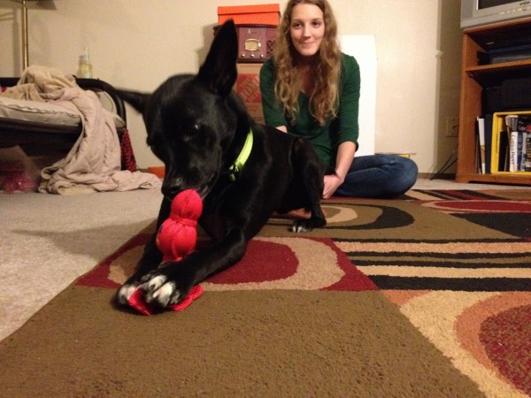 When Ava first came home with us, she was pretty shy and aloof. We were told that she was an energetic dog, so I was bummed that she wouldn’t play with me or any of her toys. We’ve been encouraging her to play by rewarding her anytime she shows interest in her toys, and by giving her a ball filled with her food in the morning and evenings.